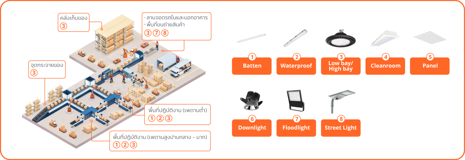 B.Grimm Technologies engineers lighting solutions to meet the rigorous requirements of industrial facilities and large-scale workspaces, providing robust and bright illumination that enhances visibility and safety. Our expertise ensures a blend of durability and efficiency tailored to meet the unique needs of each industrial setting, ensuring reliable performance and boosting productivity.
